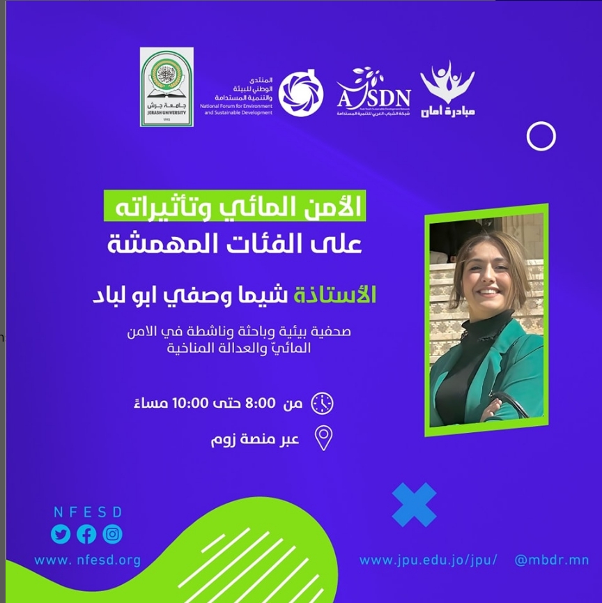 As part of the comprehensive training program to qualify youth for climate work (2024), the fifth session was held on Friday, June 7, dedicated to discussing “Water Security and Its Impact on Marginalized Groups and Gender,” with journalist and environmental activist Shima Wasfi Abu Labad “.