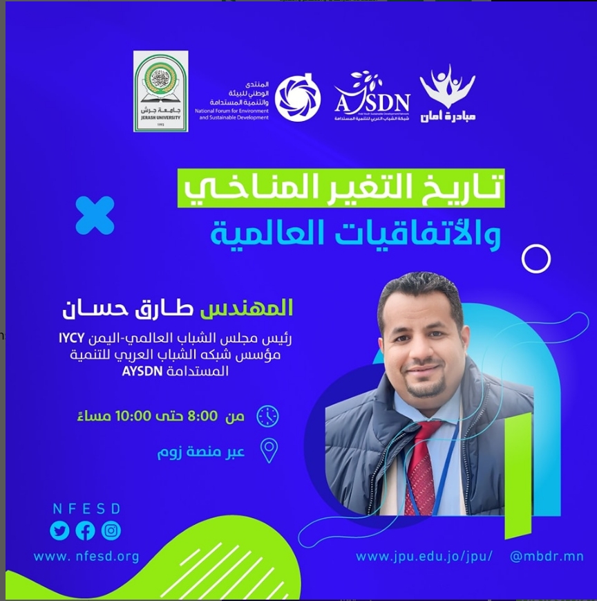 As part of the comprehensive program to qualify youth for climate work (2024), the fourth session was held on Tuesday, June 4, featuring Engineer Tarek Hassan, President of the International Youth Council – Yemen (IYCY) and founder of the Arab Youth Network for Sustainable Development (AYSDN). The session focused on “The History of Climate Change and Global Agreements.”